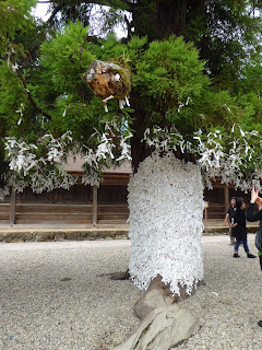 When visiting a shrine, pilgrims often pick omikuji. Omikuji is kind of fortune telling. The fortune is written on a small piece of paper which one can get from a box by making a small offering like 5 yen. When one gets a good luck, they can bring the paper home and when it's bad luck, they must fold the paper and attach it to a pine tree or a wall. Like this pine tree in the yard of Izumo Taisha is literally covered with omikuji. Looks pretty though. But not to worry. No nails attached to the tree. The authority made some kind of device made of bamboo around the three. So pilgrims can attach the omikuji without hurting the tree. I never try omikuji. I guess I am a bit coward hahaha I just don't want to get bad fortune :))
